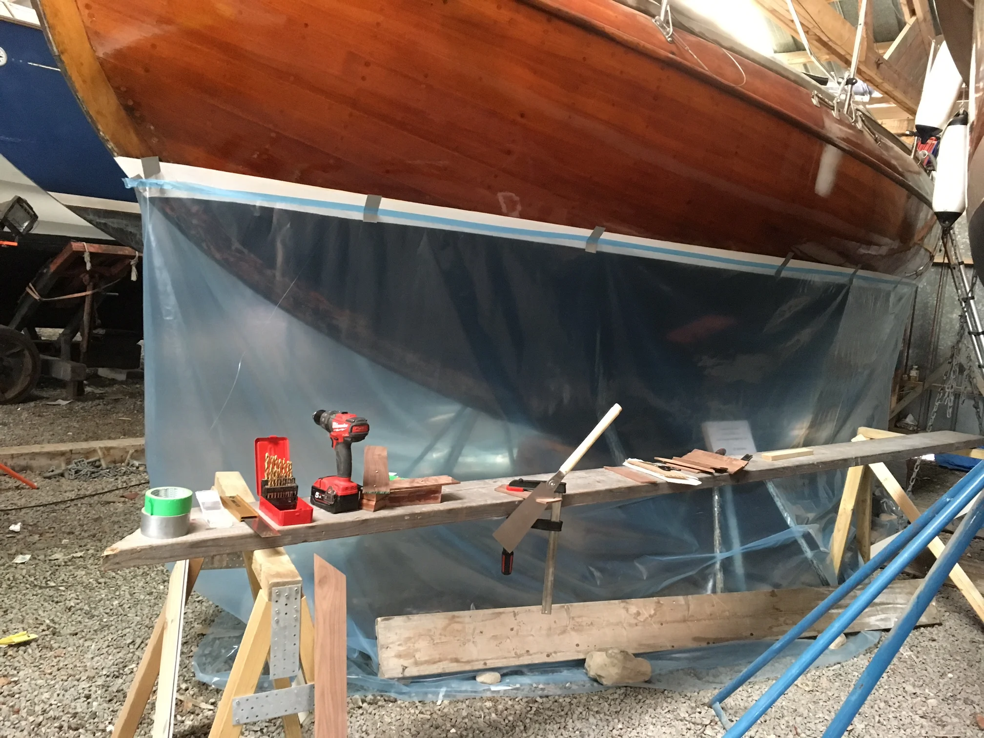 Then for jobs requiring constant adjustments against the boat I work directly under Meritaten. Building a simple bench and having access to mains is all one needs really. The only inconvenience is that I need to bring my tools every time I work there - and I can’t do much mess as the space is shared with all other boats in the boatyard.
