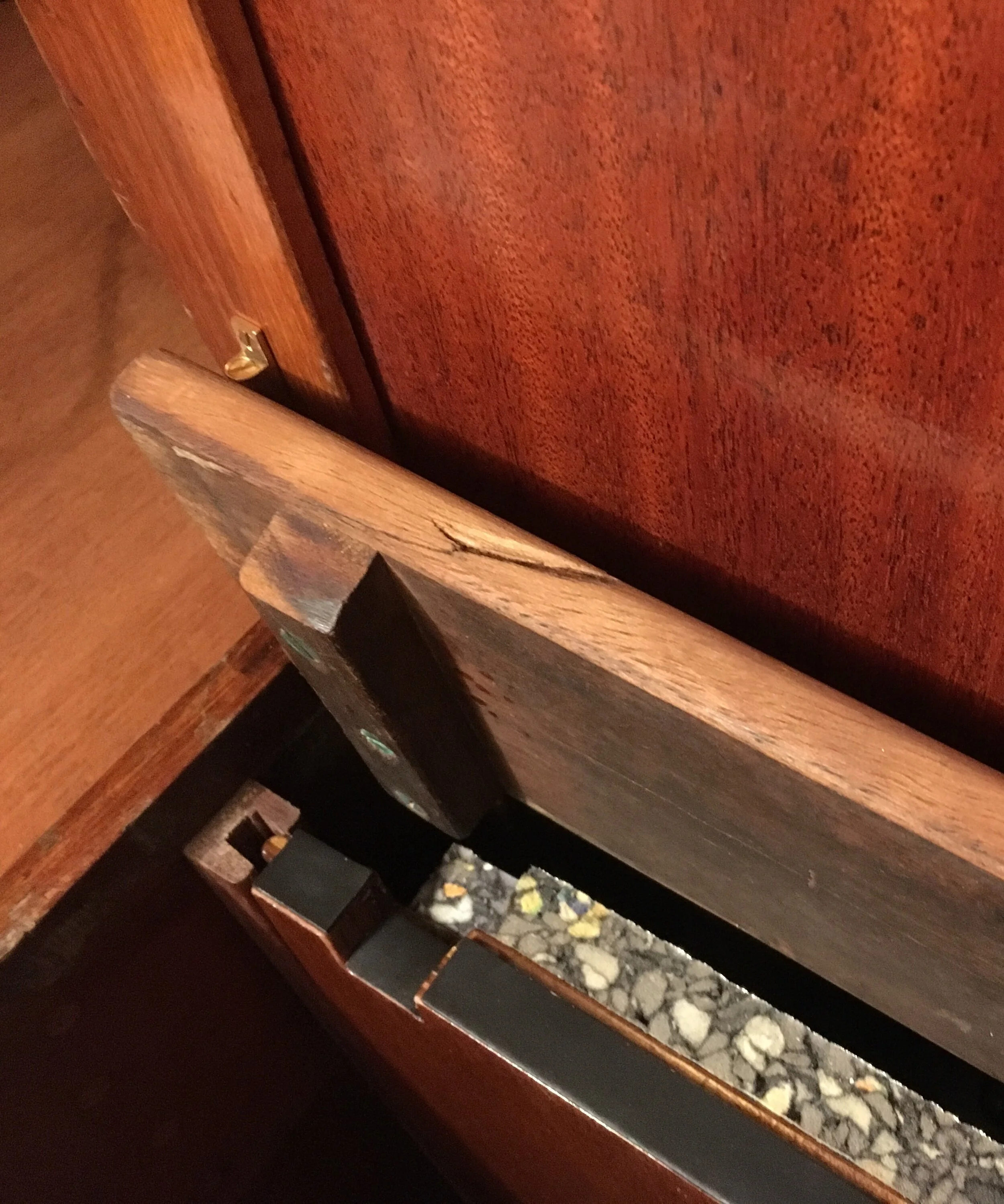 It was high time to replace it. Luckily it was attached with bronze screws but they were much oversized and looked ugly. New, properly dimensioned bronze screws fitted nicely countersinks in the piano hinge.