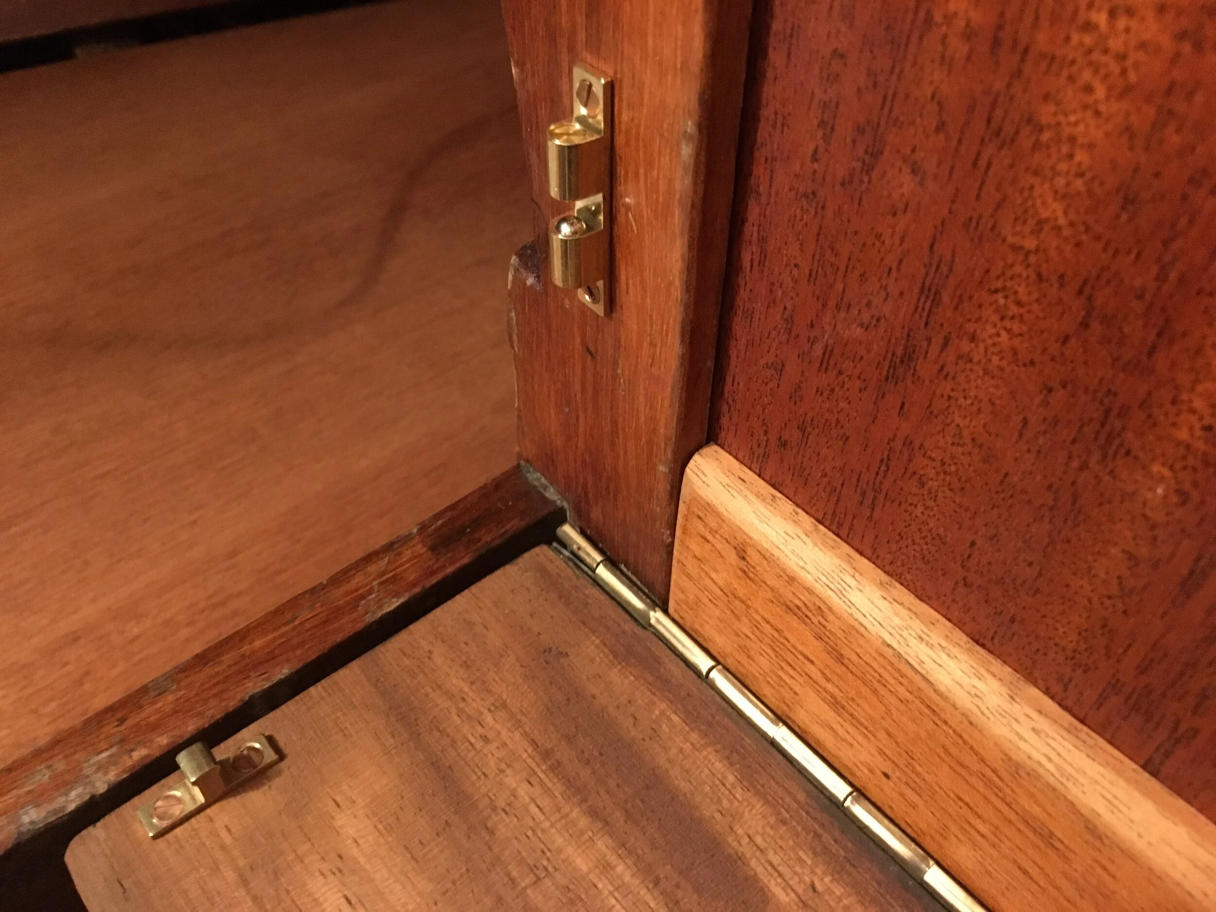 I turned then to pentry. My intended hinged work table will hang on new, brass piano hinge. I cut it from 1m stock and had enough left to replace the old and worn chromed hinge in the vicinity, holding the pentry top.