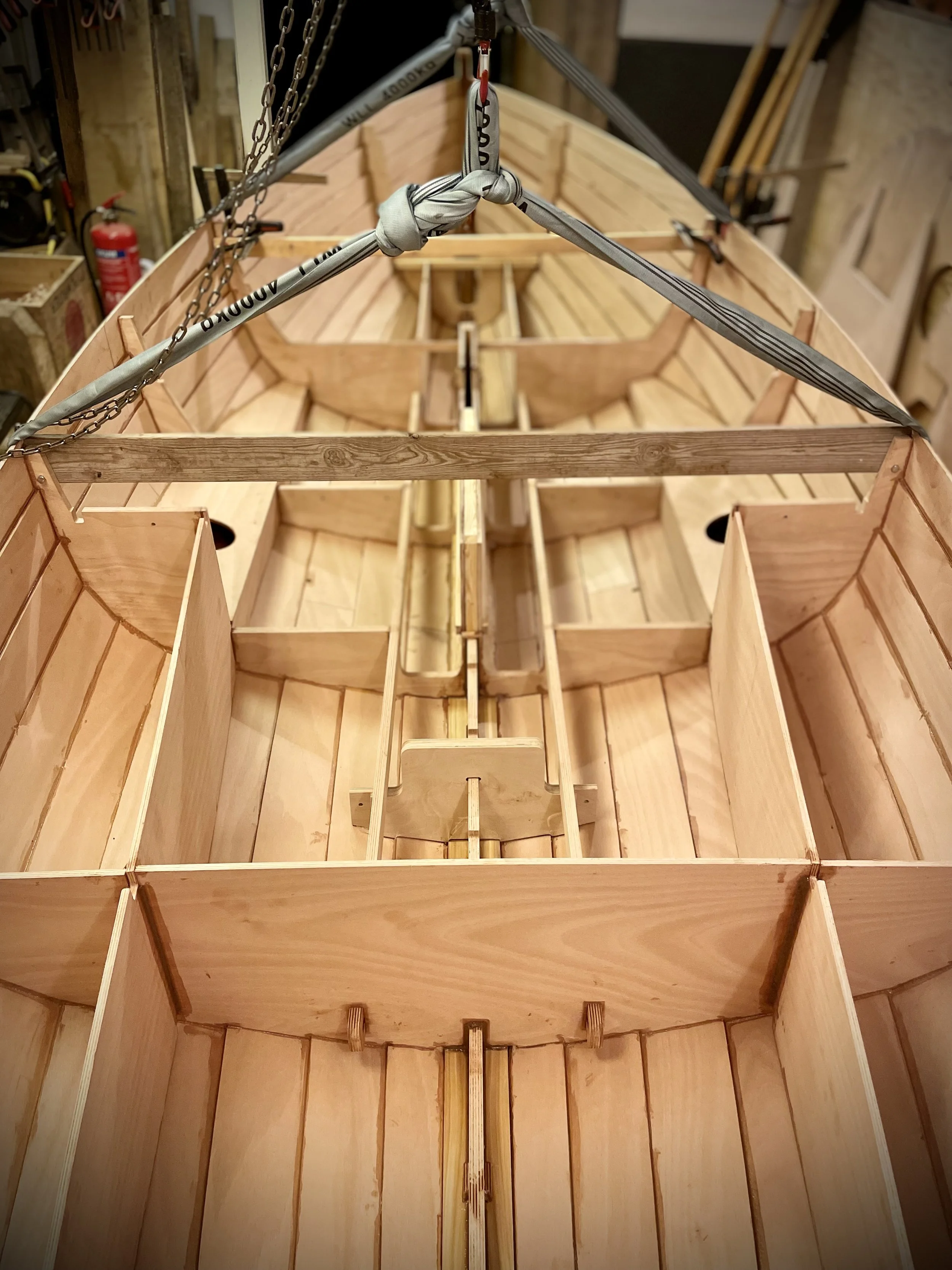 With the hull hanging free from molds I could install endless-loop straps. Padded to protect the hull.