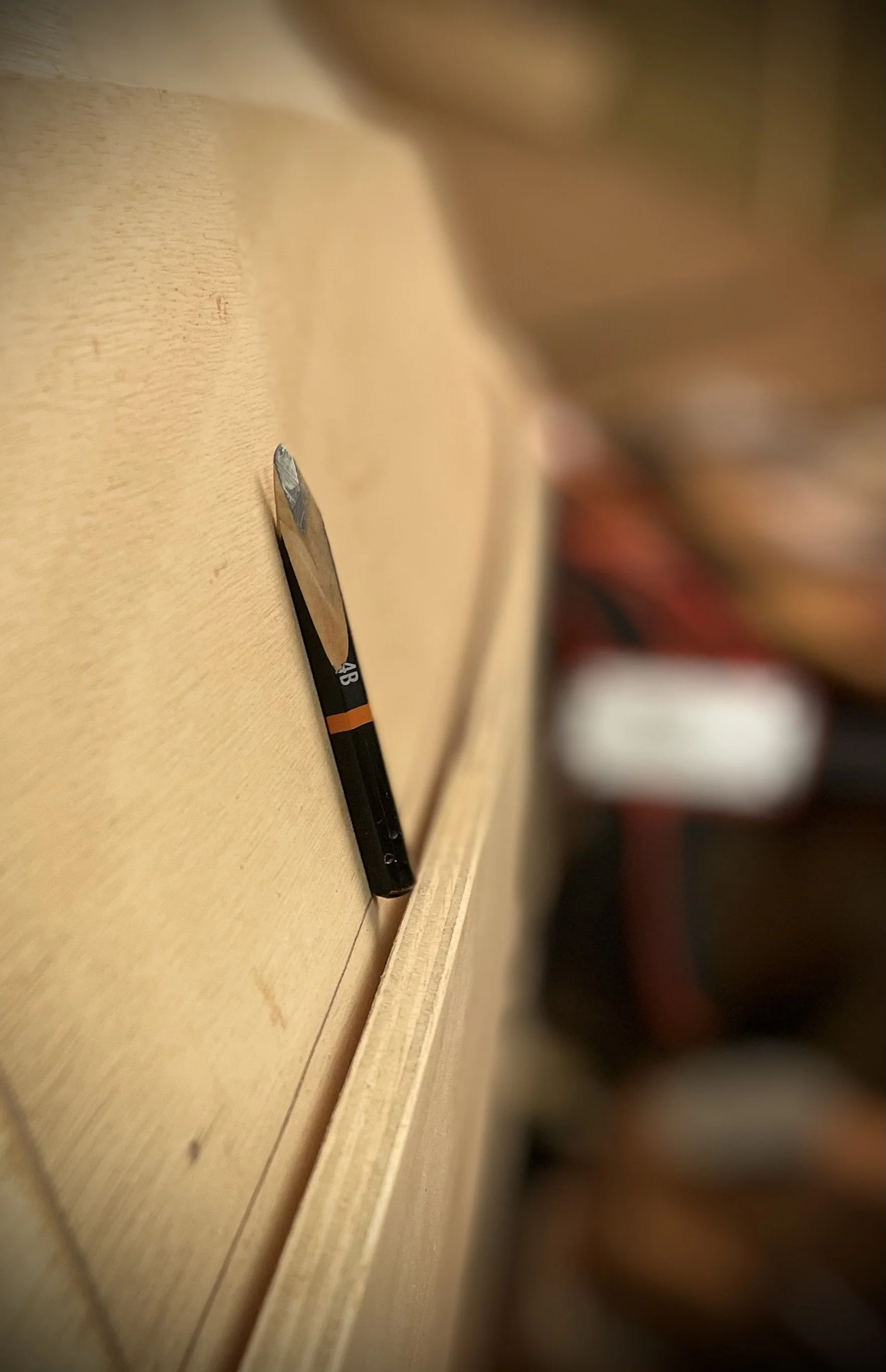 Scribing overlap line on unbevelled plank with custom-shaped pencil.