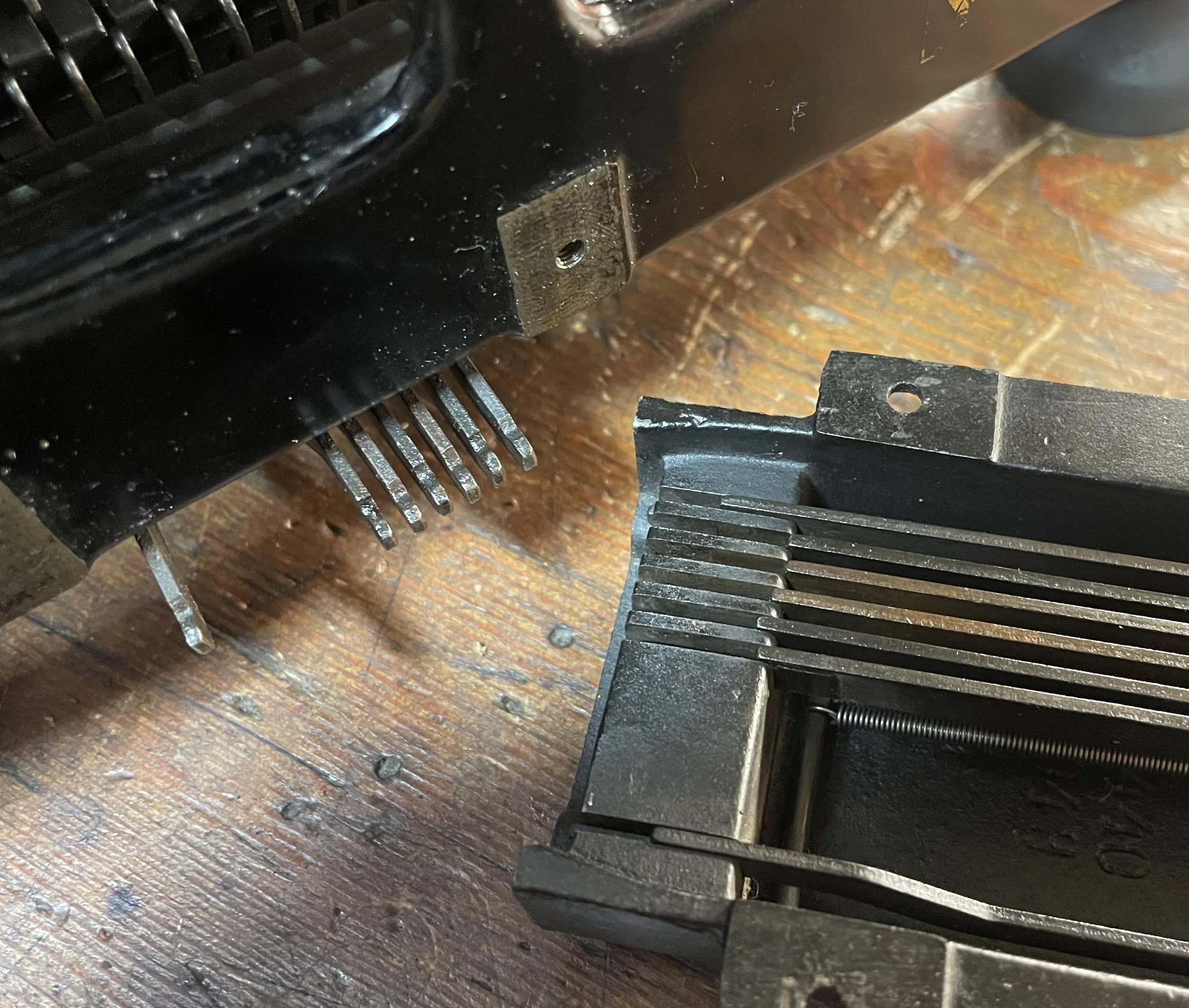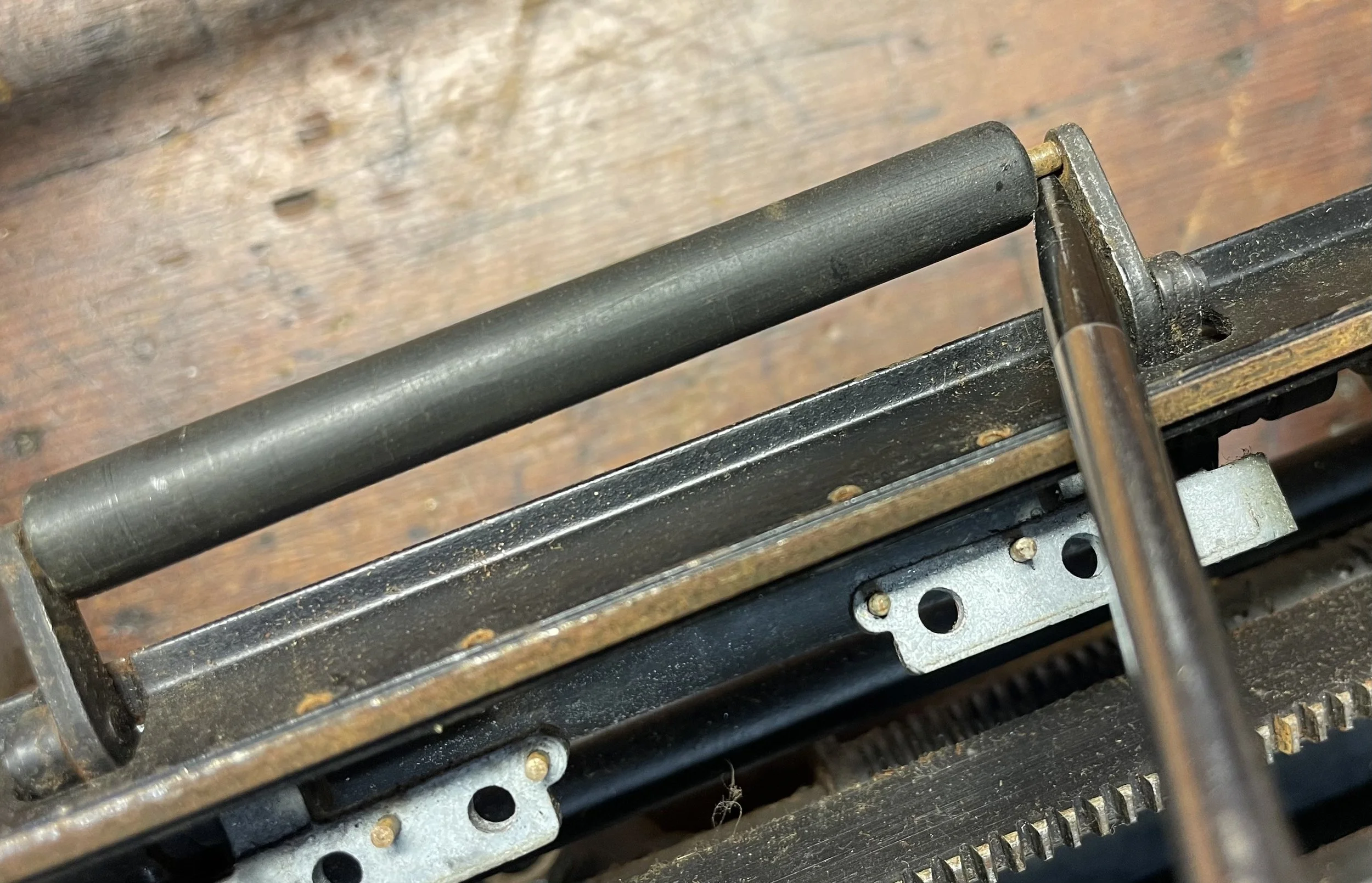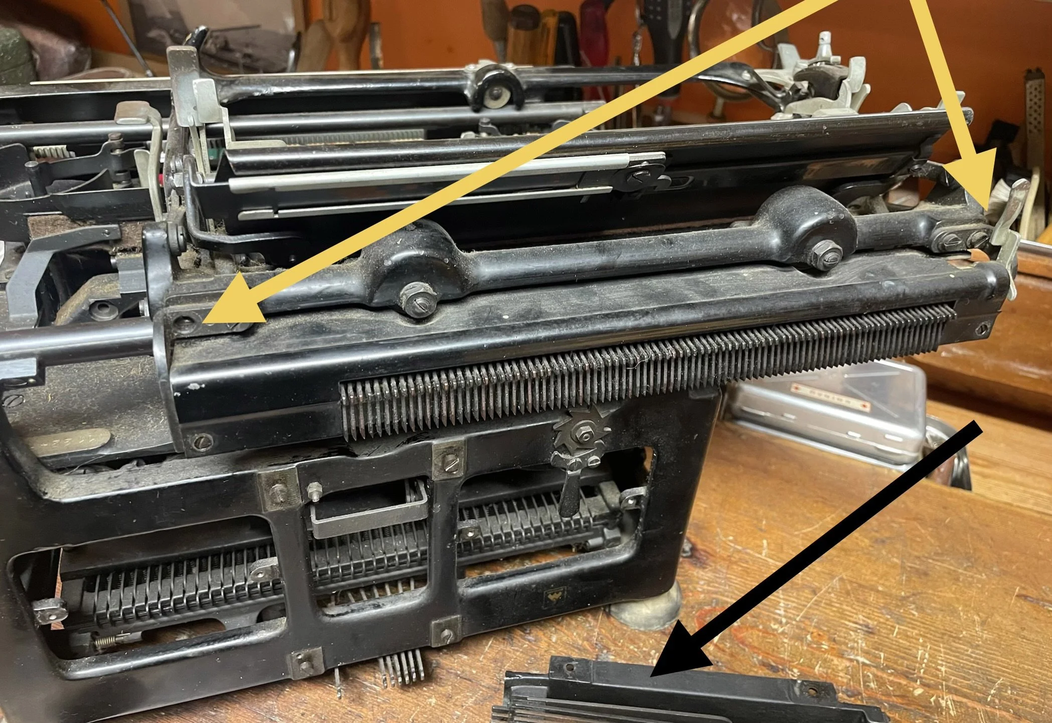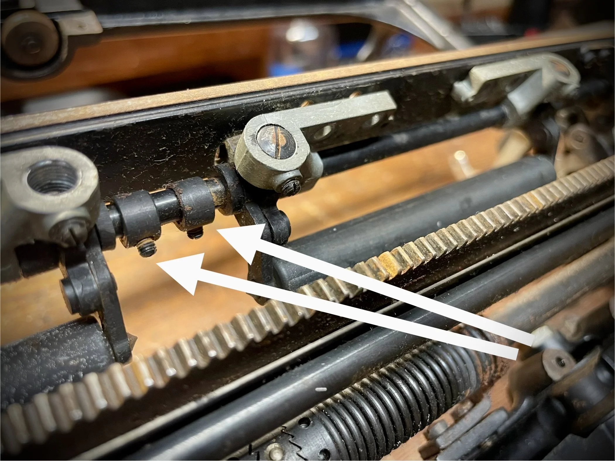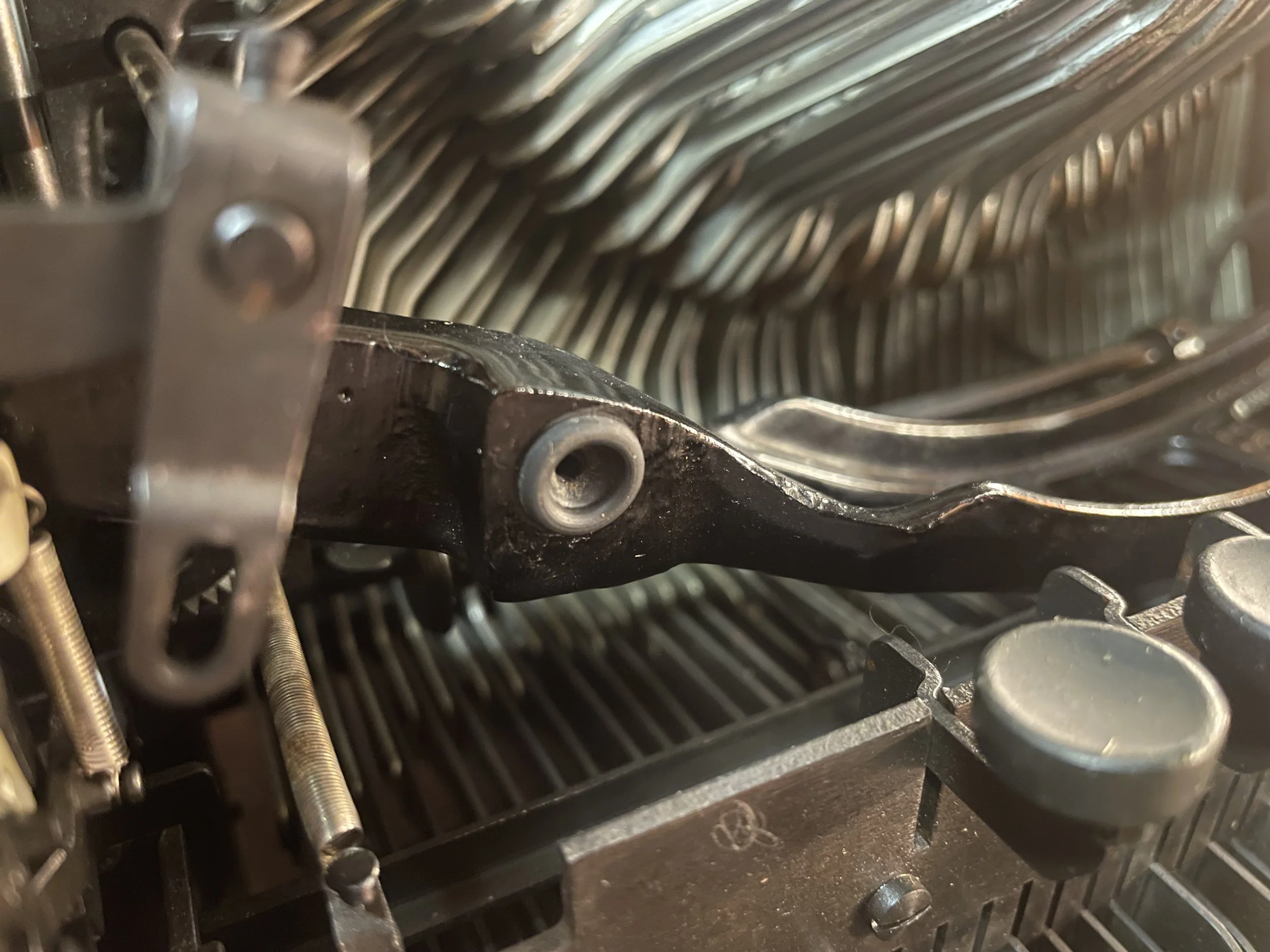 While keys are soaking I take a look at type-arms rest assembly. It is loose and seems incomplete. I use the machine from Grim as a reference - yes, there are rubber spacers where the type arms rest attaches to the frame.