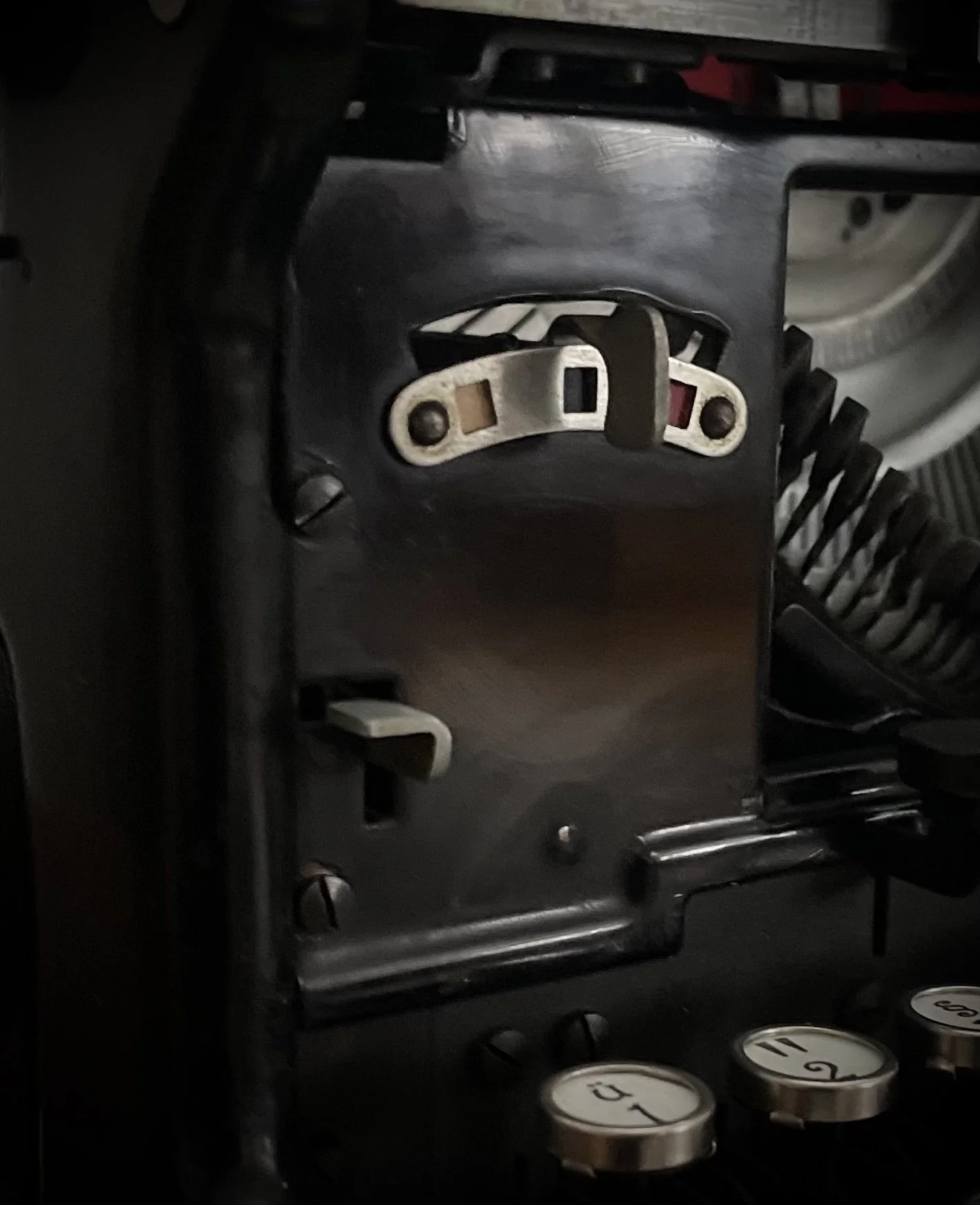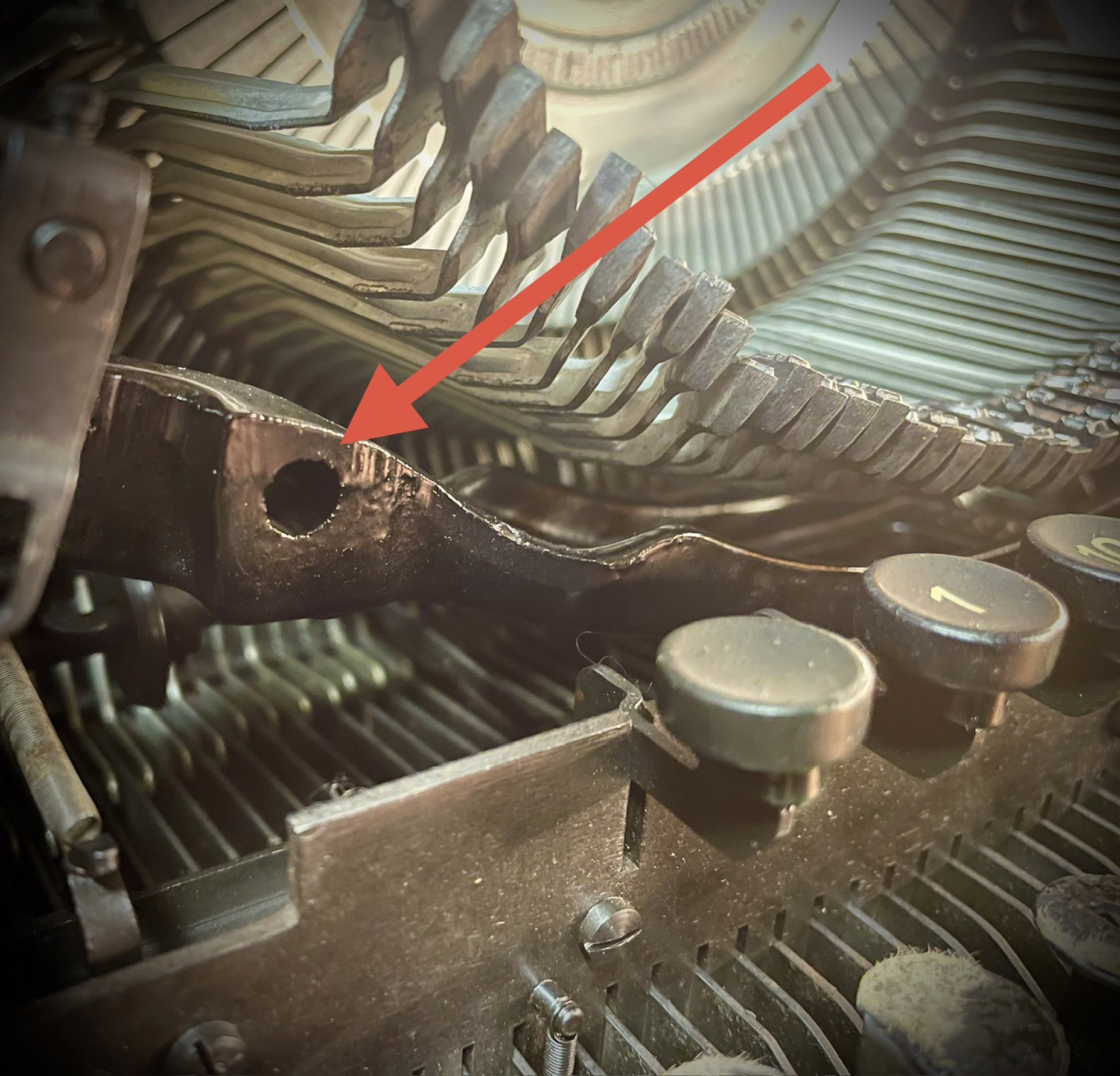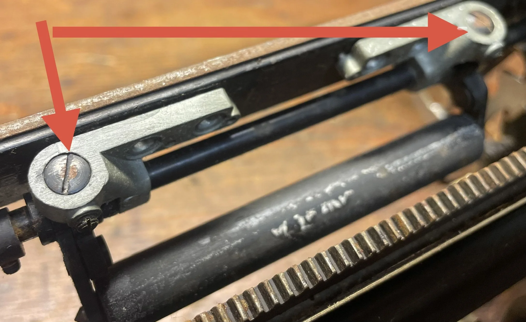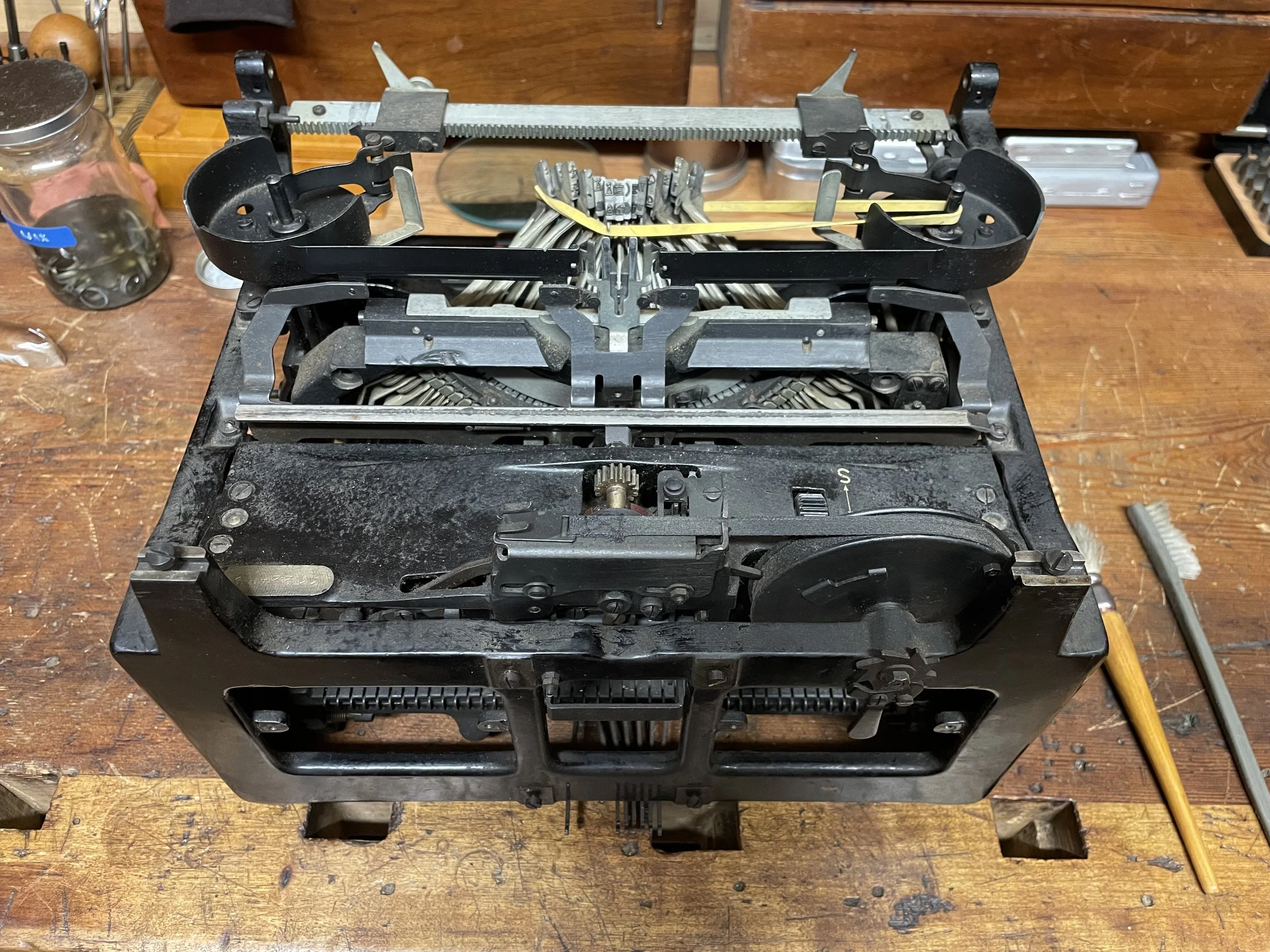 While keys are soaking I take a look at type-arms rest assembly. It is loose and seems incomplete. I use the machine from Grim as a reference - yes, there are rubber spacers where the type arms rest attaches to the frame.