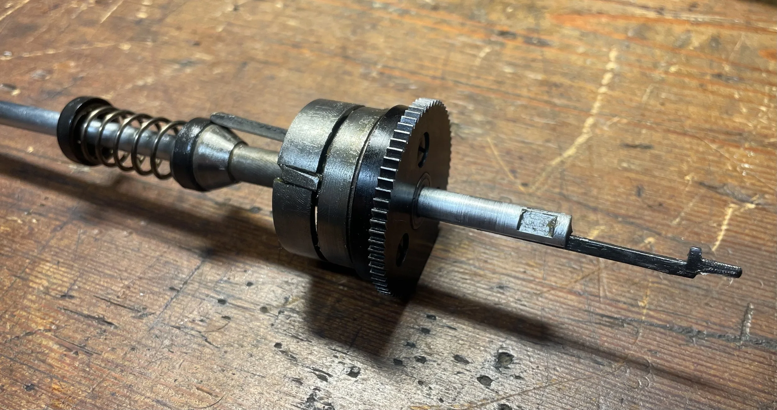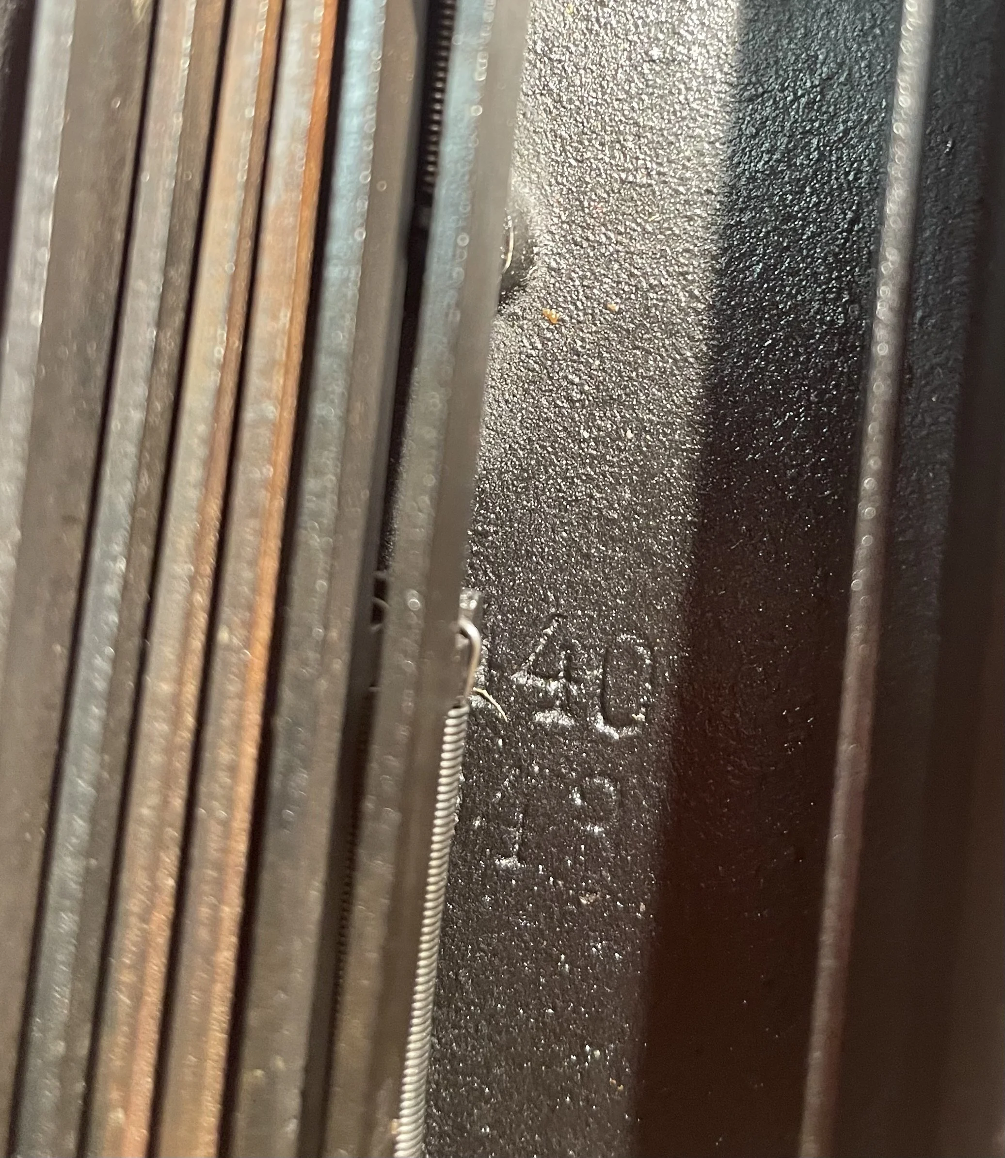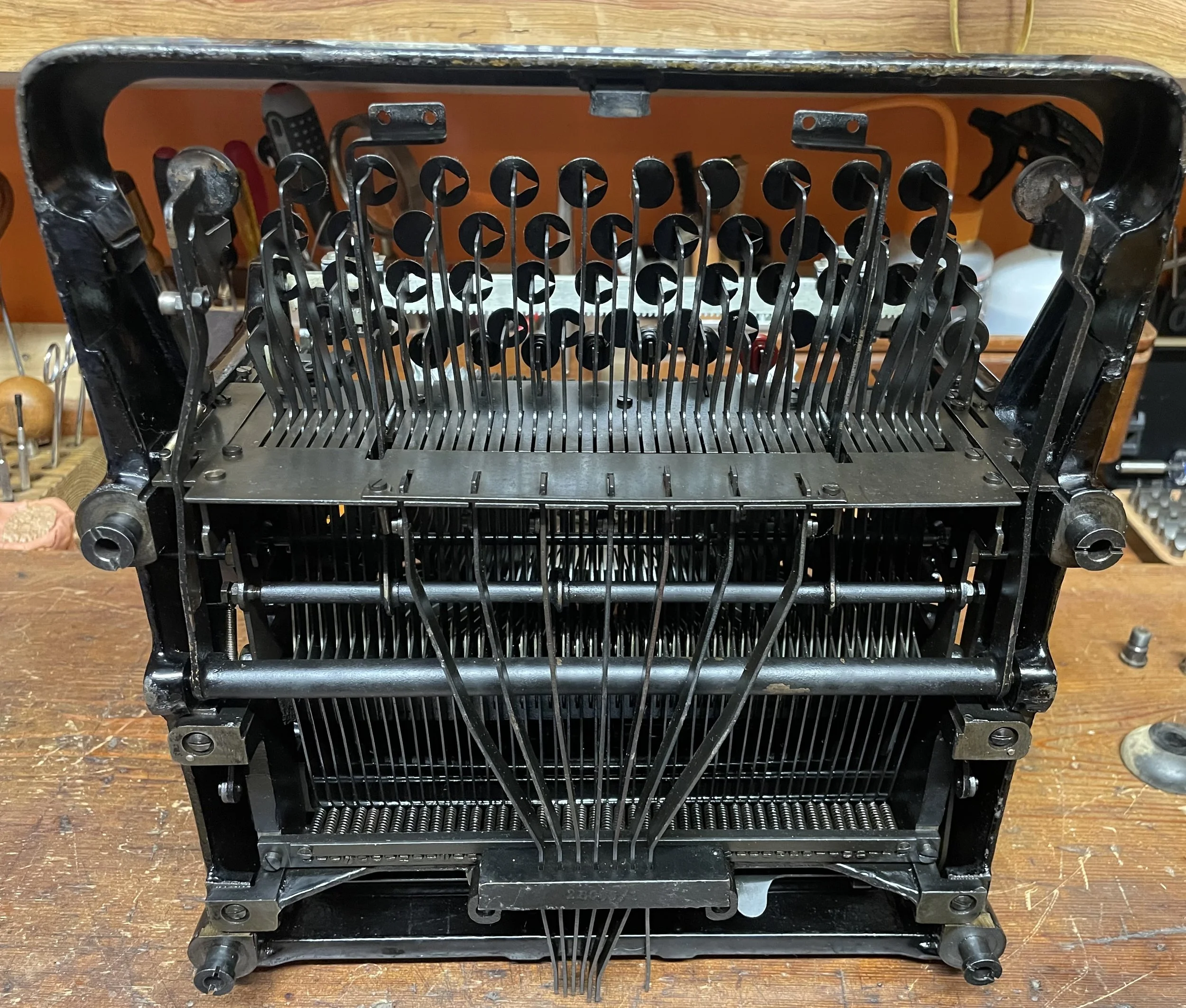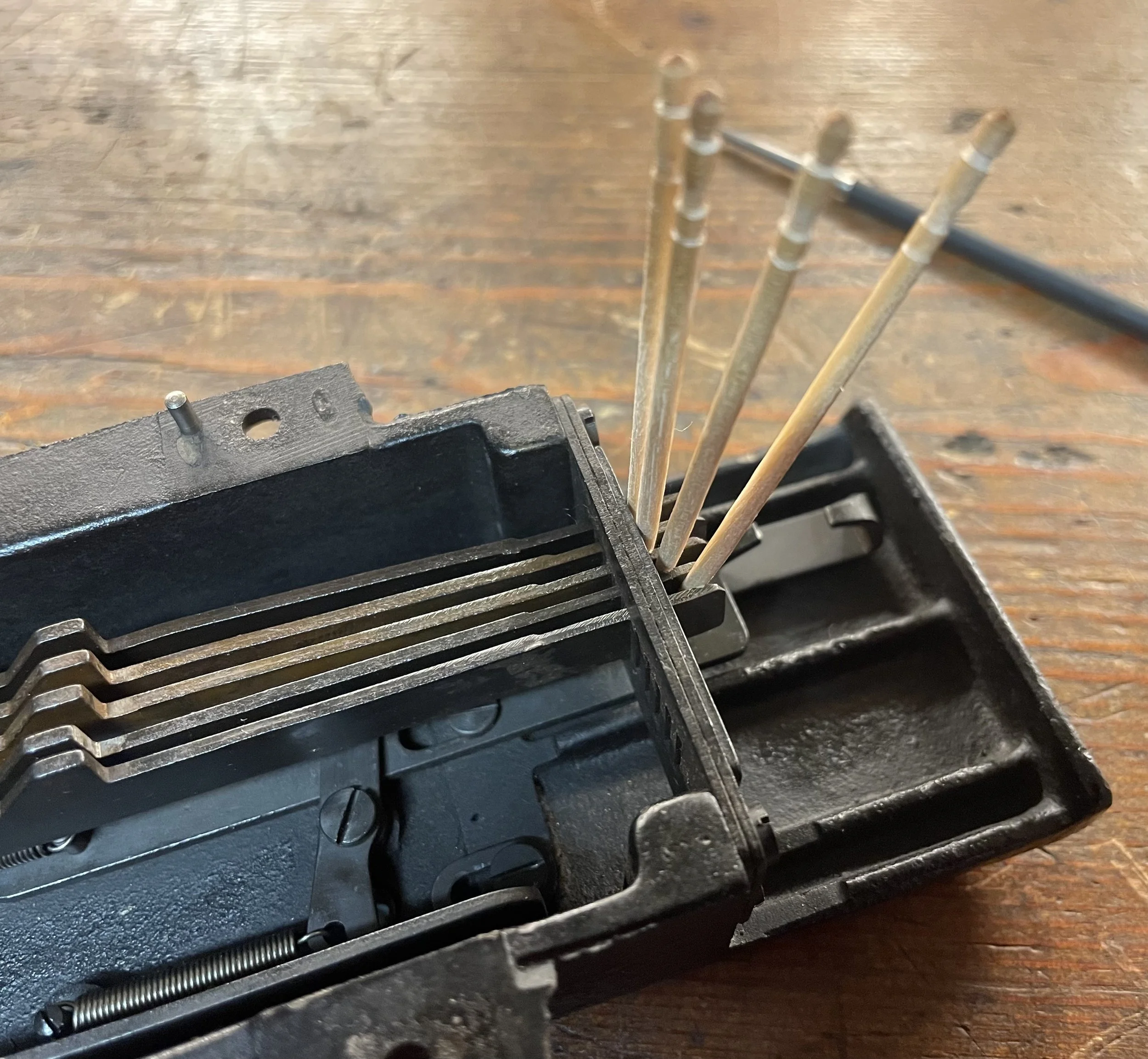 Tabulator triggering assembly is a bit tricky as the pushers are spring loaded. Notice also that there is a date stamped on the inside, dating this machine to 1943.