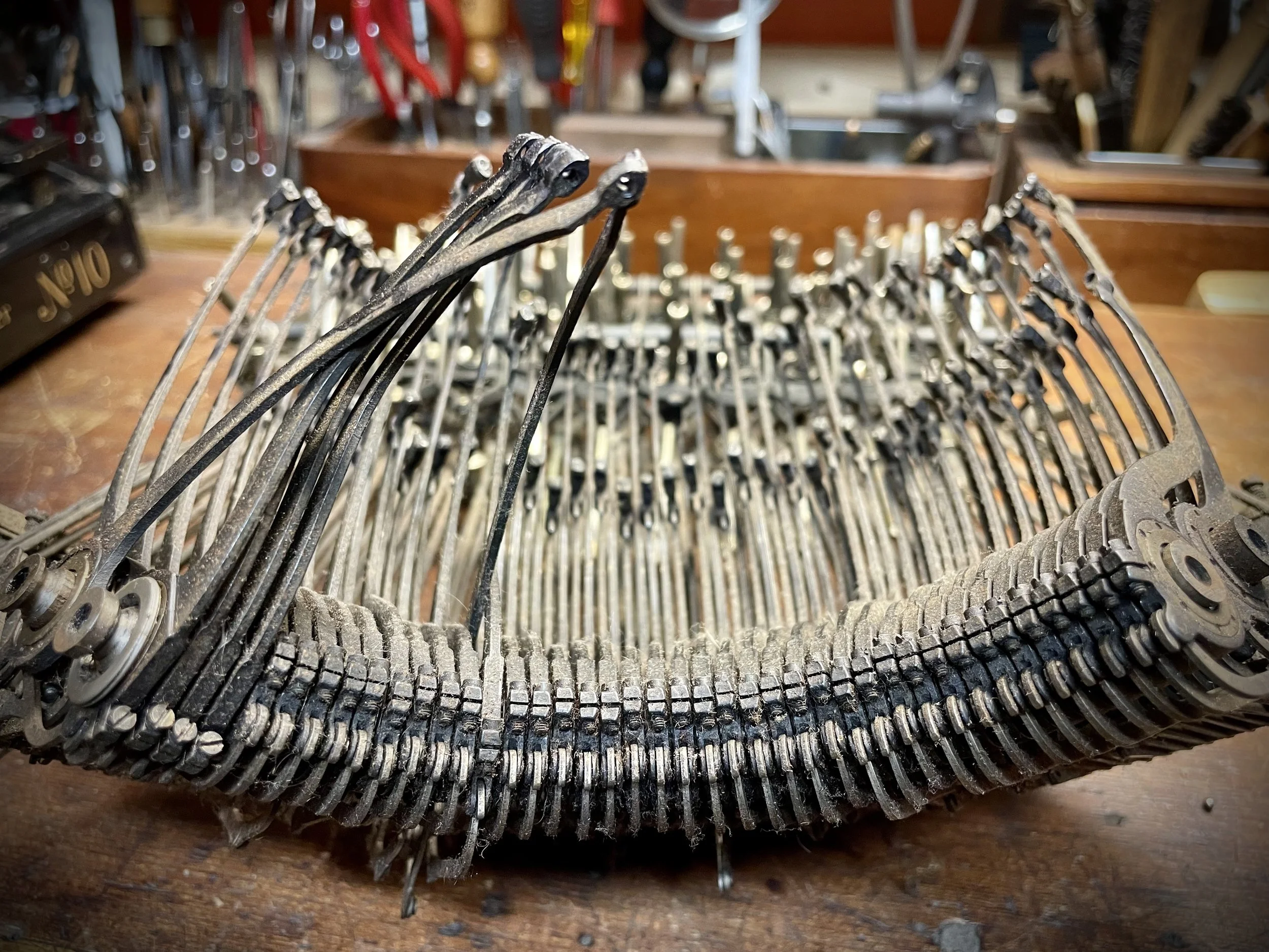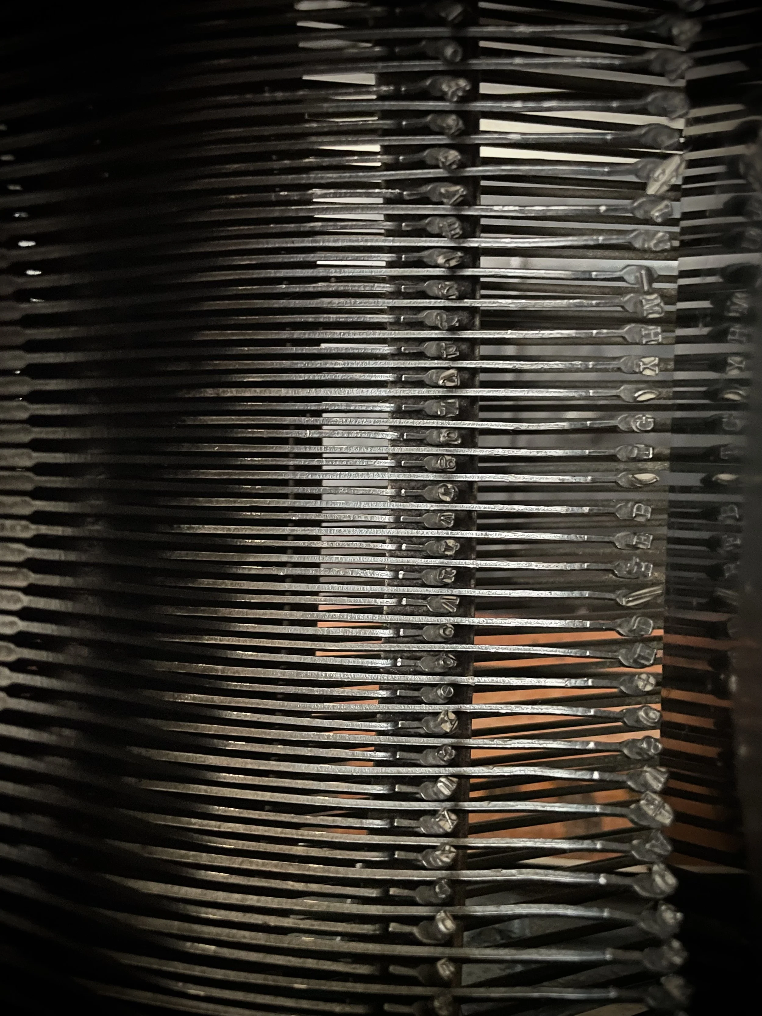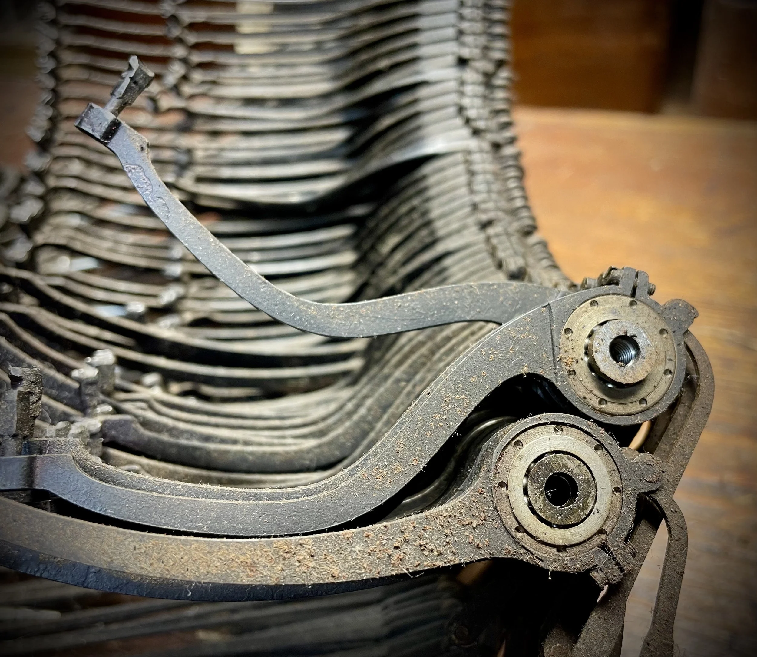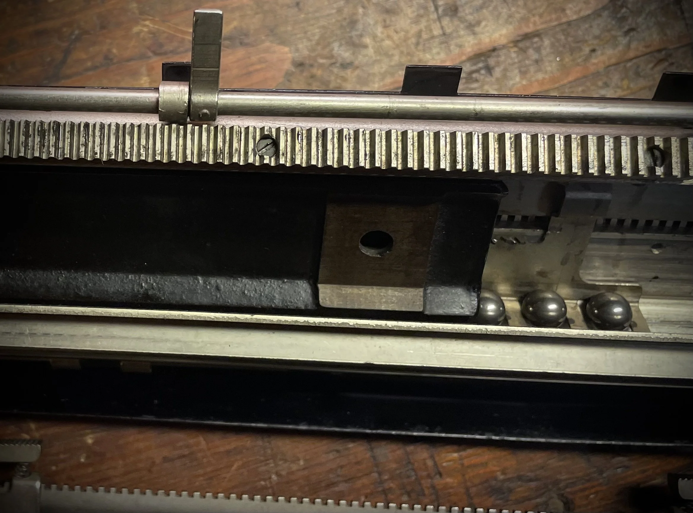Type arms on this machine are hanged on ball bearings. As there is one sign per slug, and per arm, there are a lot of bearings organized cleverly in two rows.