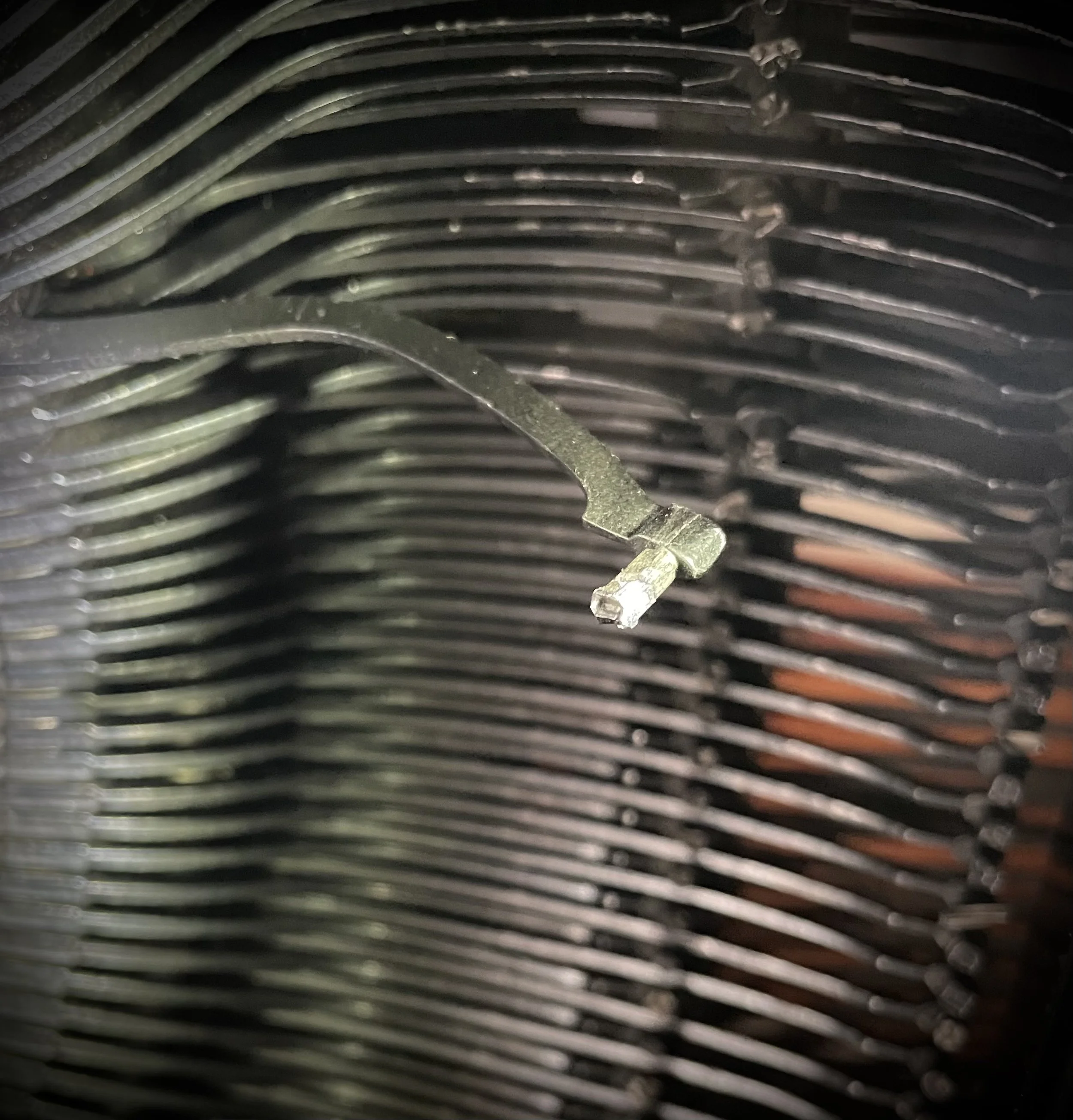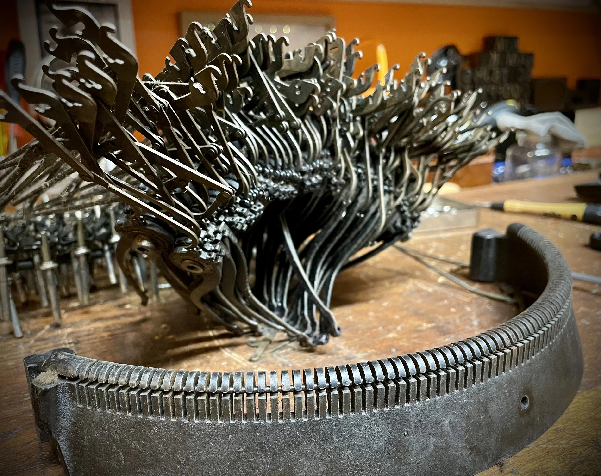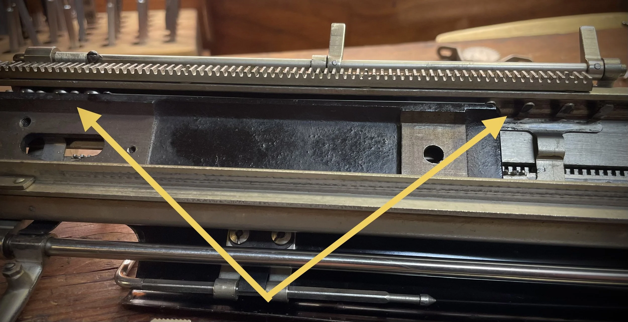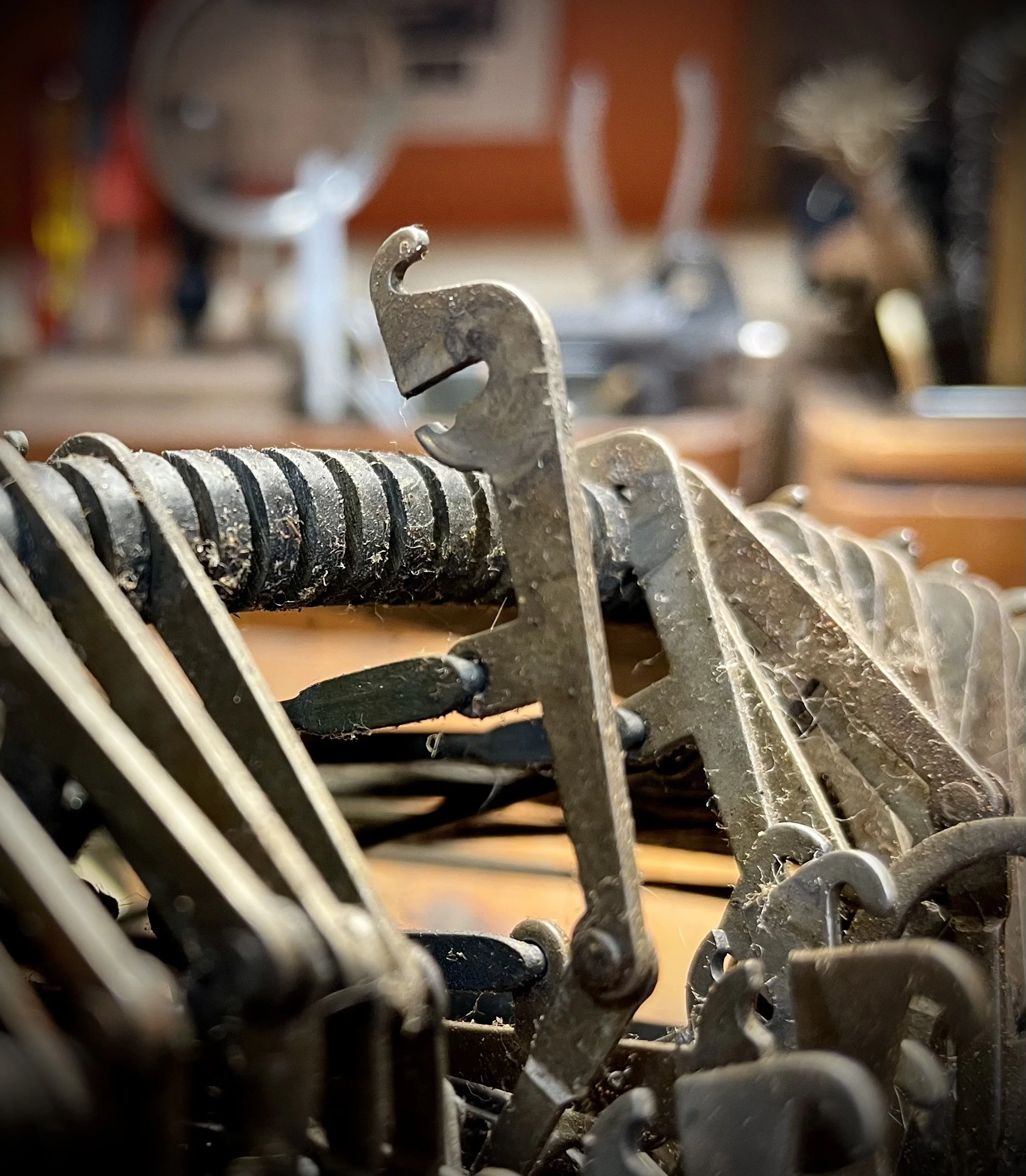 Type arms on this machine are hanged on ball bearings. As there is one sign per slug, and per arm, there are a lot of bearings organized cleverly in two rows.