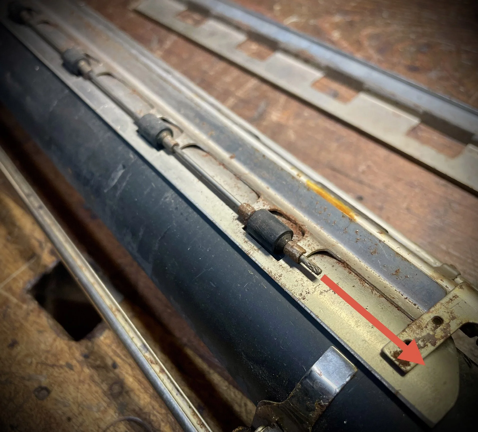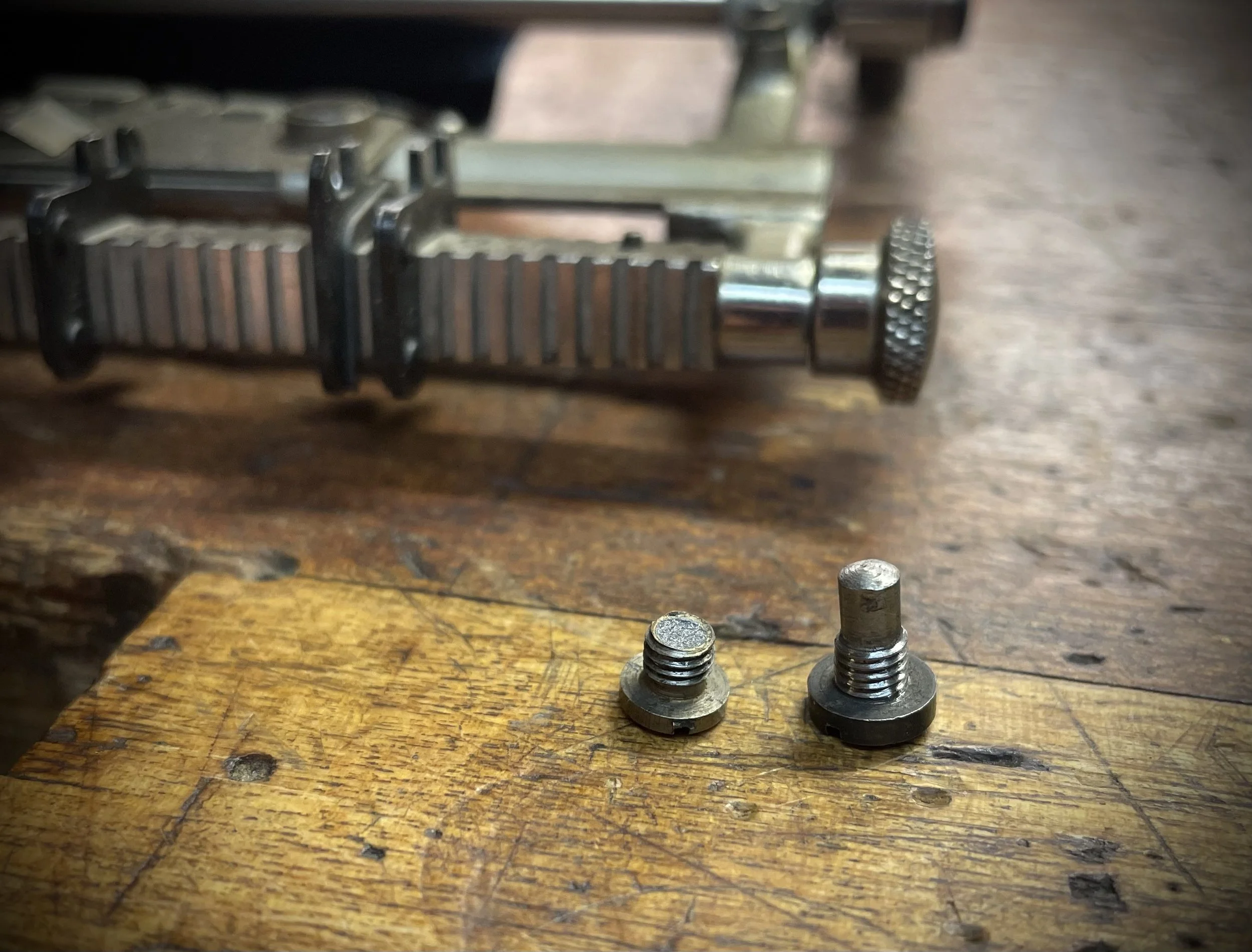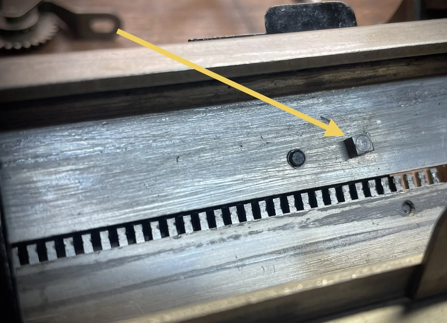 Screw which engages with them is close to small wheel which in turns glides on two sets of toothed rails beneath. To protect it from damage and easier work I unscrewed it.