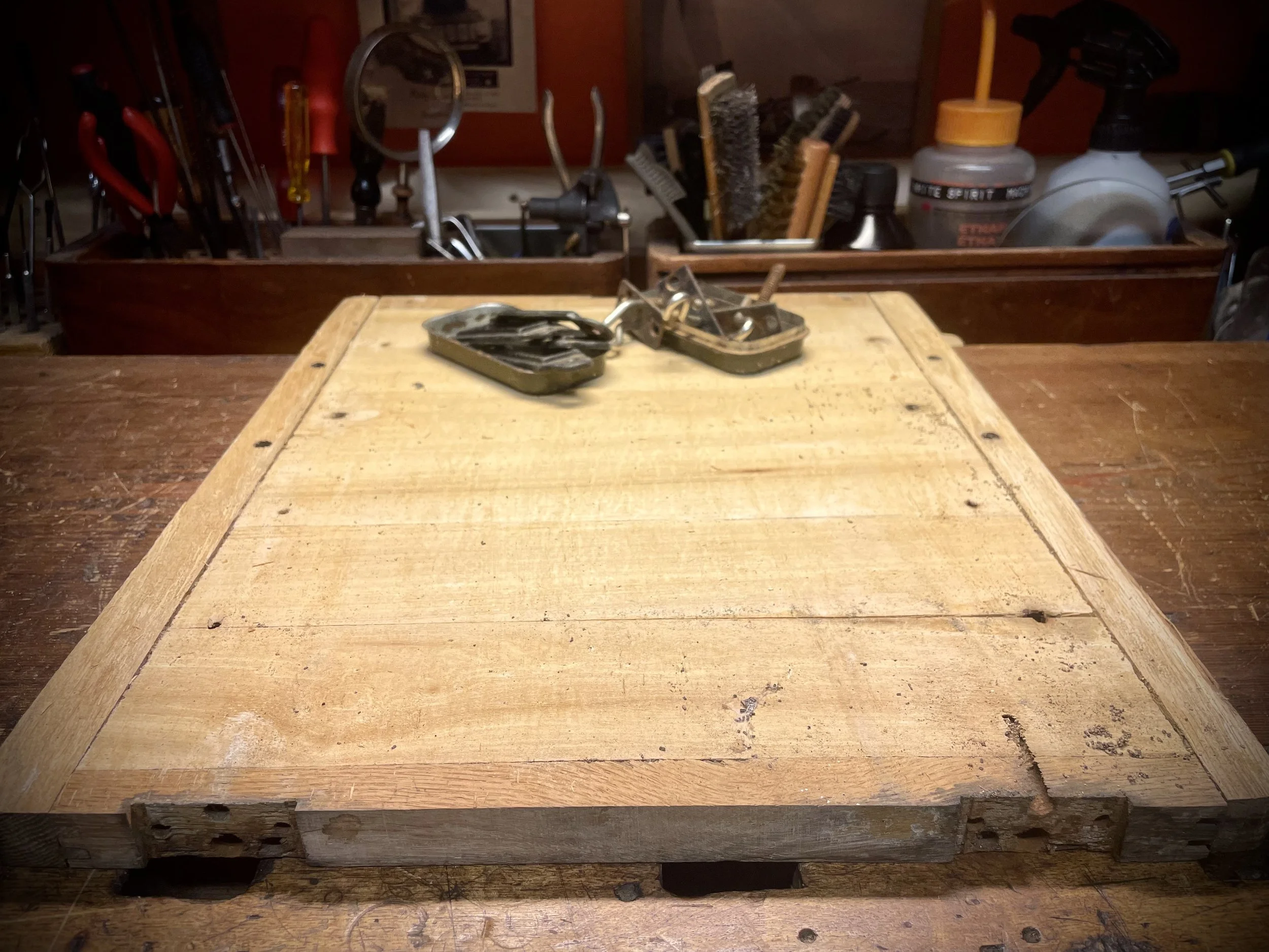 Top veneer removed, fittings unscrewed and brushed from rust clean. Some apparent mishaps in manufacturing of this board are now seen once veneer is gone.