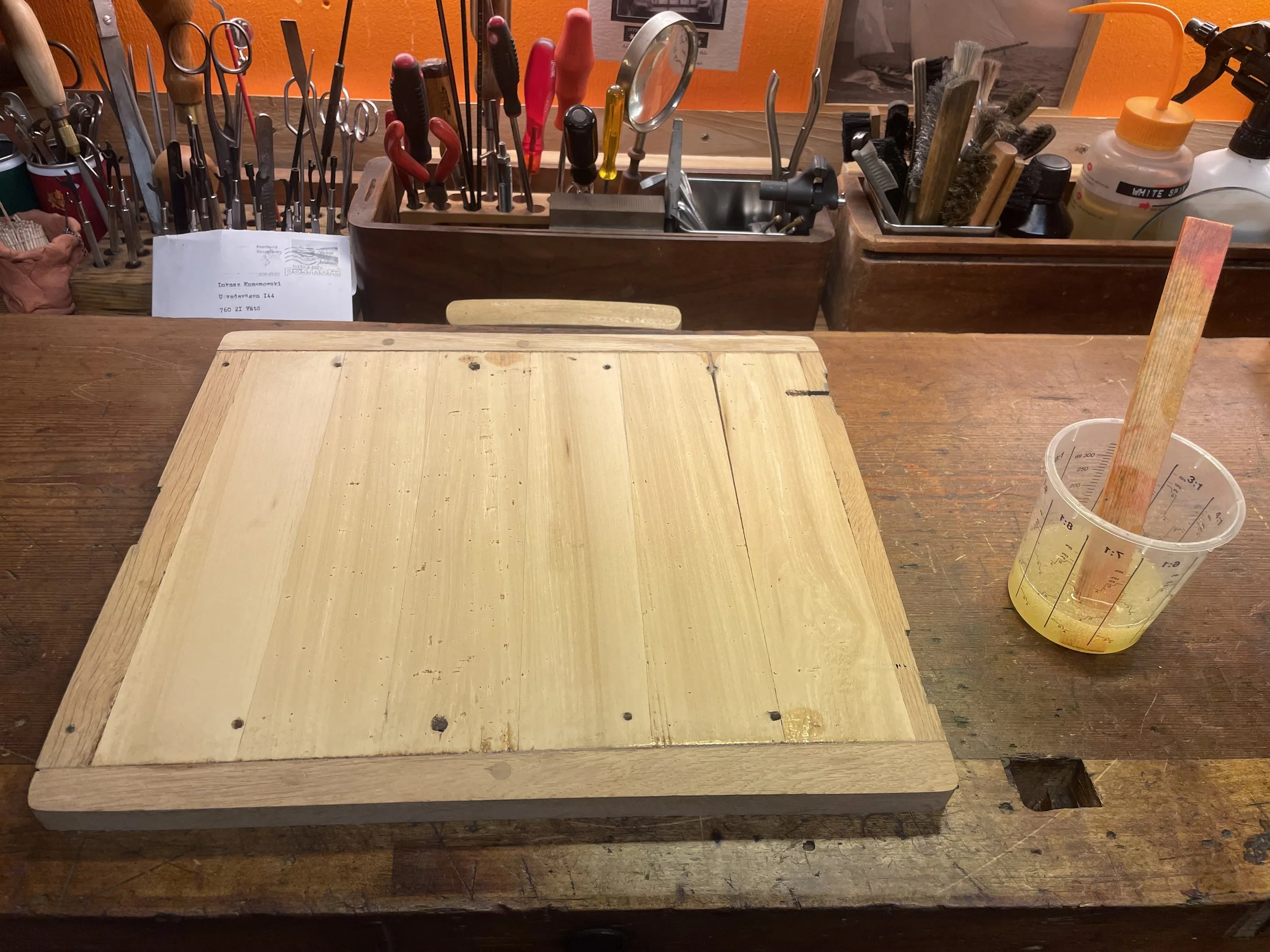 A day later the glue is cured, the board cleaned and sanded again, ready for stabilizing soaking in epoxy.