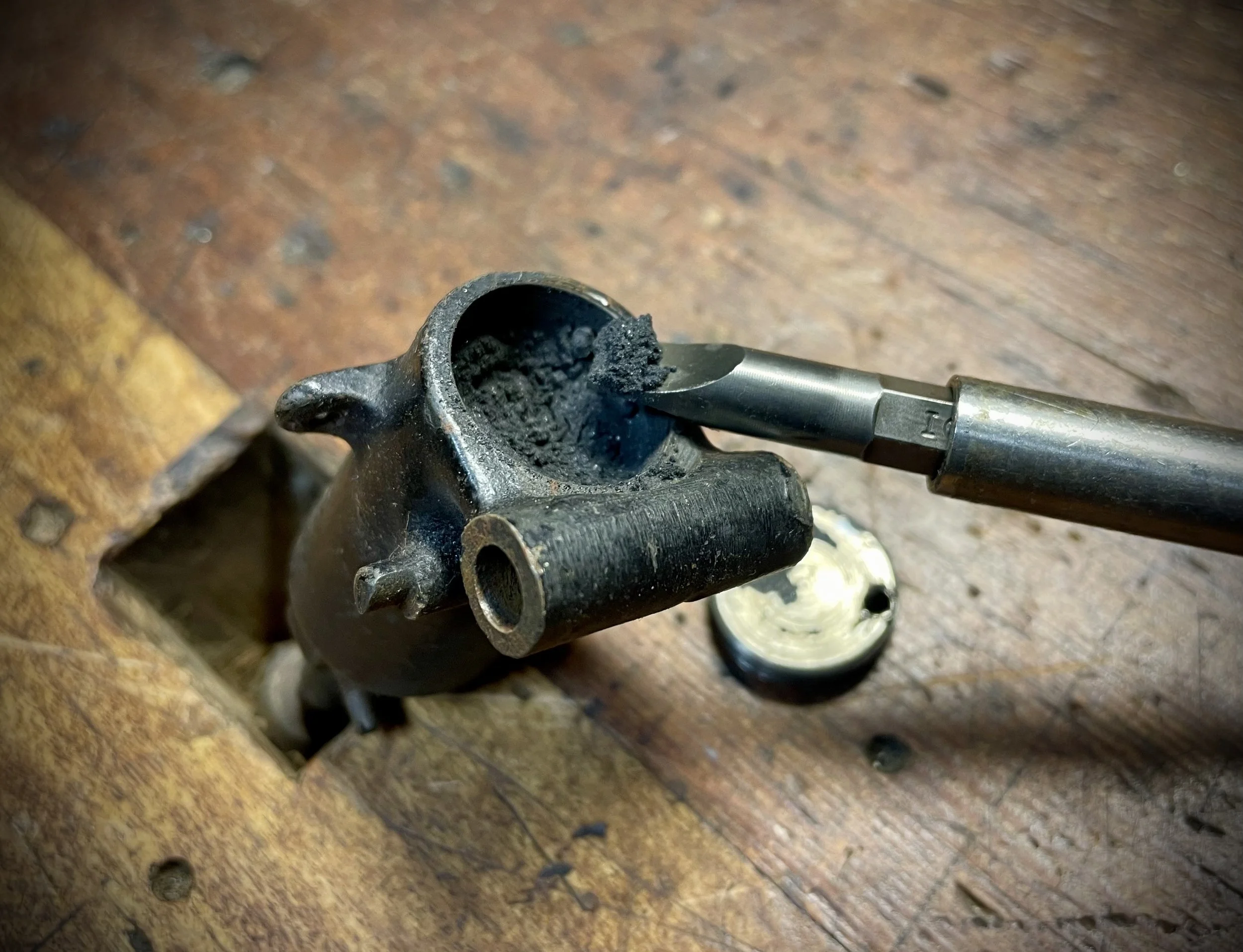 Compression of the powder is adjusted by a big nut (yellow arrow), small screw (green arrow) is locking the position.
