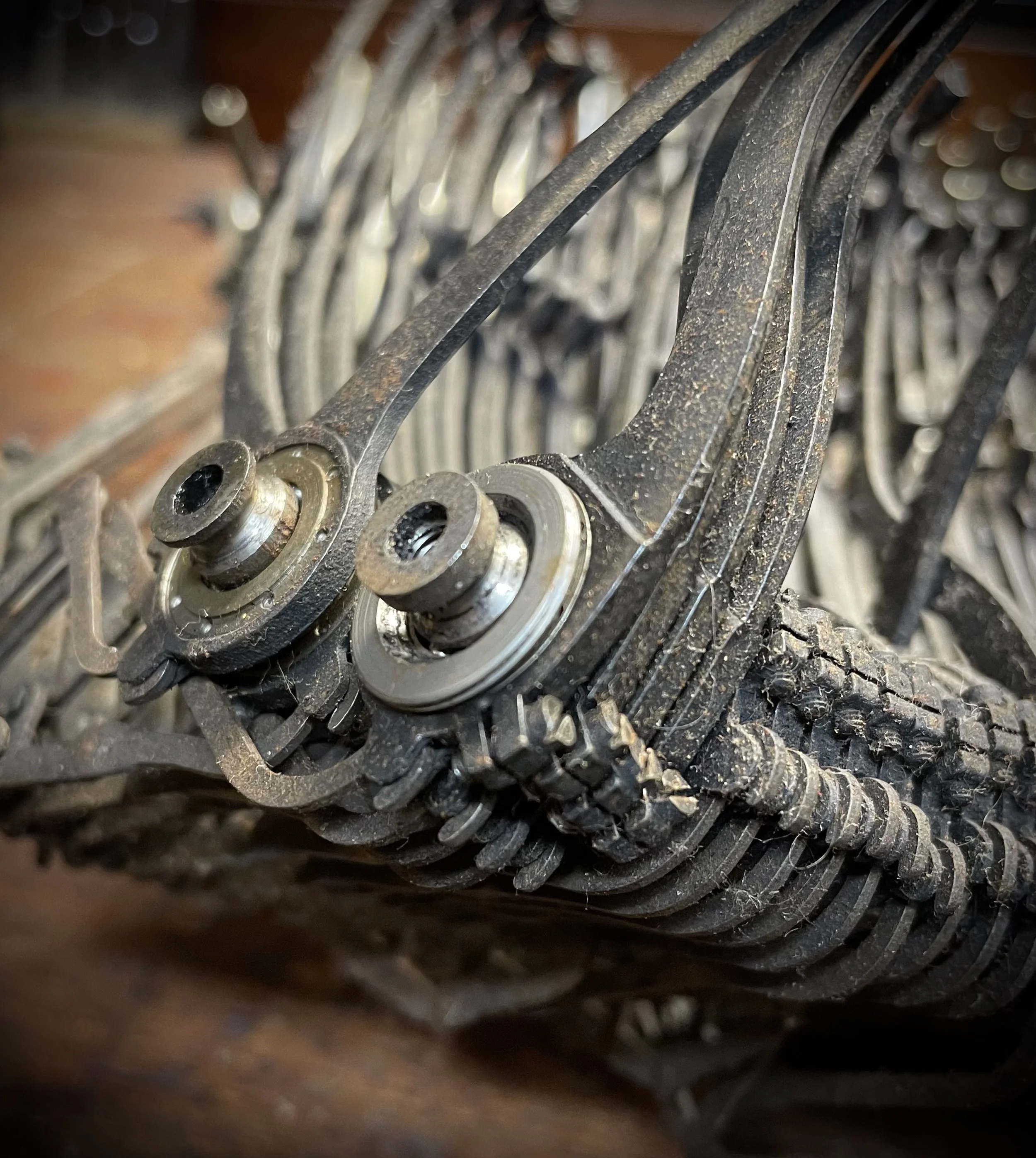 Actuator springs for each arm are smartly hidden under the bent, steel cover, protecting them from dirt and unintentional decoupling.