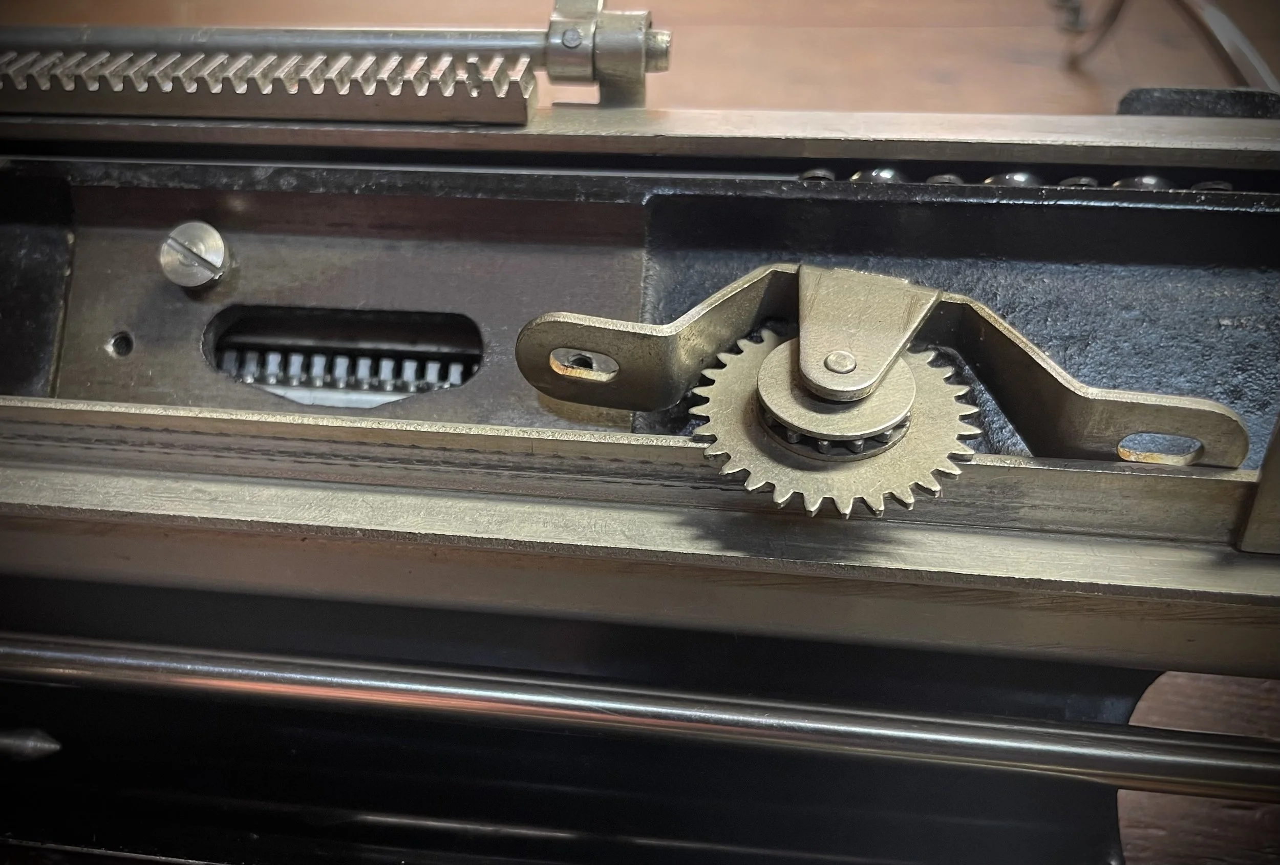 This machine has an interesting tabulator mechanism. Basically one has 4 tabulator settings on rotatable single tabulator bar, with tabs formed to engage with one of four prongs related to specific “tabulator program”. Good explanation of this is given by Geir on his channel here.