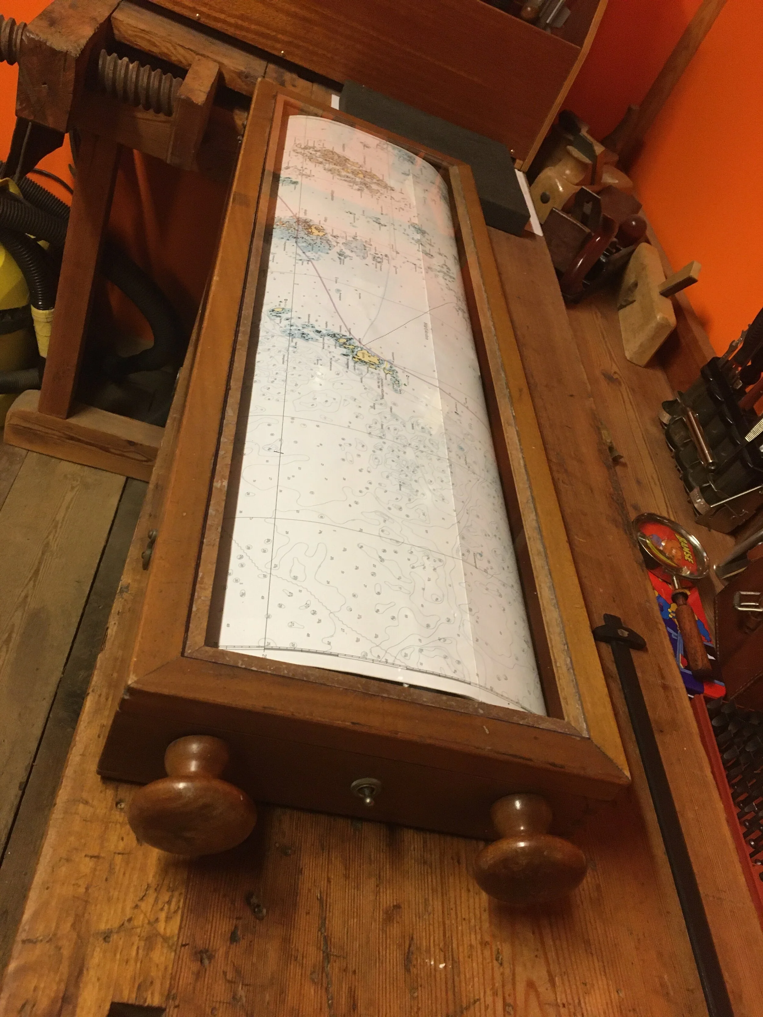 I like browsing through junkyards, in search of objects like this one: mahogany box with wooden rollers and small light bulbs to illuminate maps. Old-times plotter, enabling reading big-format maps in confined space. Confined space + mahogany = Meritaten so I acquire this dirty and broken piece of marine equipment.